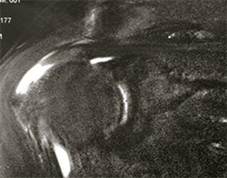 MRI scan: showing full thickness, full width tear of the supraspinatus tendon.